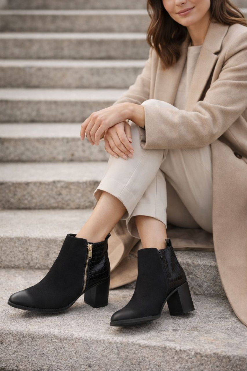 “Pièce incontournable de la saison, ces bottines allient style et caractère. Leur design raffiné apporte une touche moderne à vos tenues, qu’elles soient décontractées ou élégantes. Faciles à associer, elles se portent aussi bien avec un jean qu’avec une jupe ou une robe, pour un look chic et affirmé en toutes circonstances.”